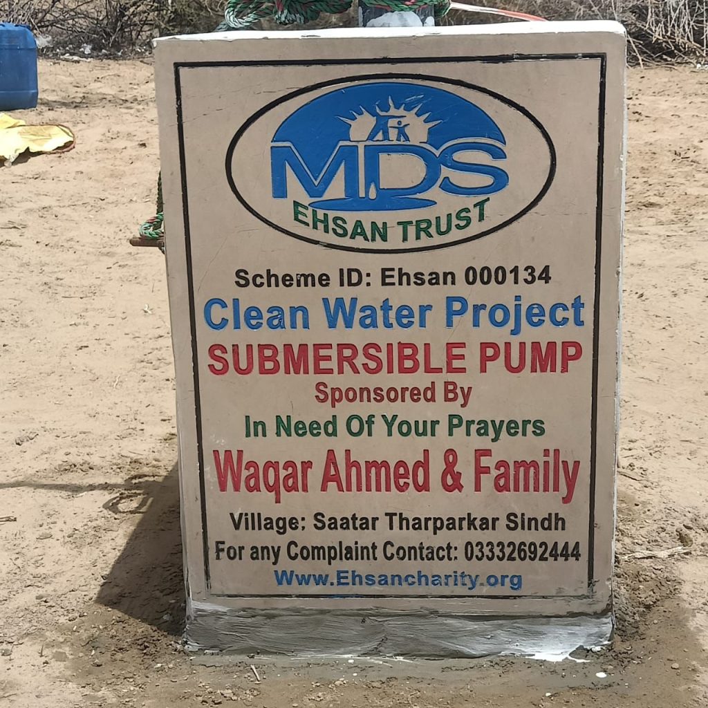 A submersible pump is installed in Tharparkur Sindh whete 100 families will get clean drinking water.